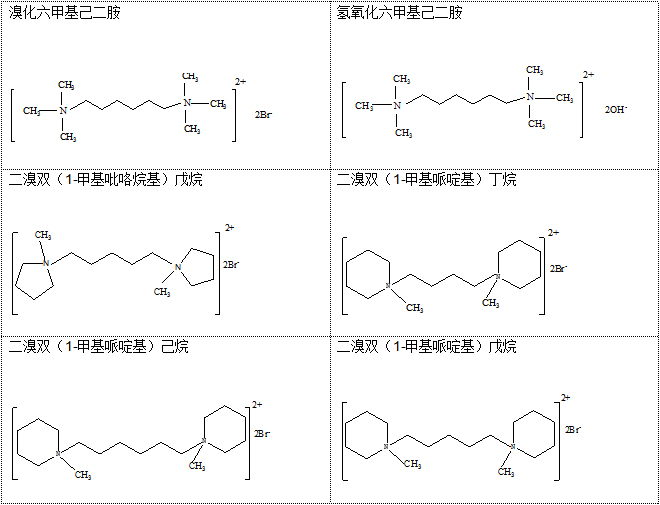 模板劑在分子篩的合成中起到模板,結(jié)構(gòu)導(dǎo)向,空間填充劑,平衡骨架電荷影響產(chǎn)物骨架電荷密度等多種作用,它對分子篩類型結(jié)構(gòu)孔道大小、比表面積甚至活性有很大的影響。我們致力于高品質(zhì)季銨堿(低金屬離子、低鹵素離子)模板劑的開發(fā),以及新型模板劑的設(shè)計(jì)和研究,如雙氮季銨堿化合物: